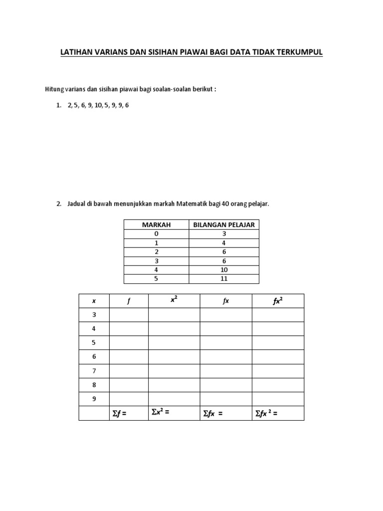 Latihan Varians Dan Sisihan Piawai Bagi Data Tidak Terkumpul Pdf